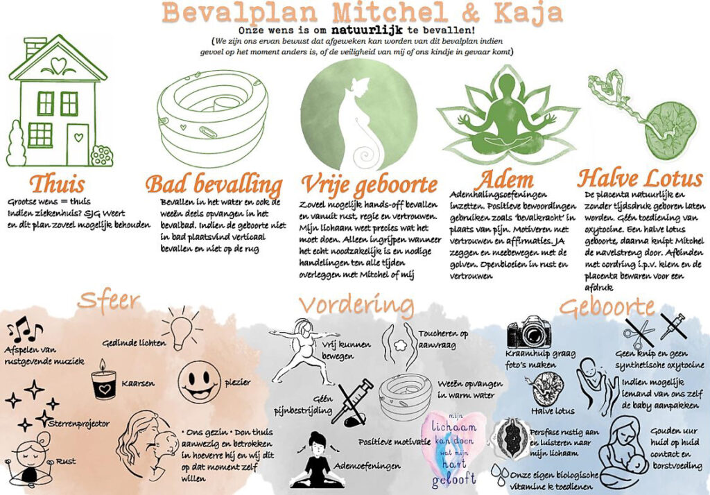 ‘Rond twee uur ’s nachts begint het te rommelen. Ik ben 39 weken en 2 dagen zwanger, précies dezelfde draagtijd als bij mijn eerste zoontje. Ik word wakker van wat lichte krampen en dacht meteen: zou het nu echt gaan beginnen? Ik had er zo ontzettend veel zin in. Met het maken van een geboorte moodboard (birth map), het lezen van Mijn reis naar binnen en het Vrije Geboorte boek en het maken van ons bevalplan waren de voorbereidingen gedaan. Mijn droom is een natuurlijke thuisbevalling in bad, zoveel mogelijk hands off bevallen en vanuit rust, regie en vertrouwen. Géén pijnbestrijding, positieve motivatie en ademhalingsoefeningen. Vrij kunnen bewegen en een halve lotus geboorte. Ik weet alles over het geboorteproces, wat belangrijk is voor de natuurlijke oxytocine, het kunnen indalen van het kindje en wat mij hierbij zou kunnen helpen. Vooral kijkend naar wat mij zou helpen, wetende dat ik vandaaruit de controle los mocht laten.