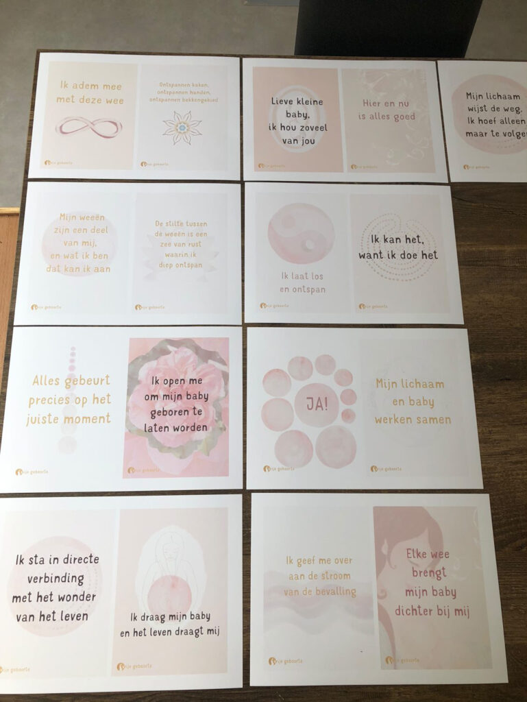 Ik ga terug in het bad. Mitchel zit aan de rand van het bad en bij elke wee telt hij rustig mee met mijn ademhaling. Ik kijk naar de affirmaties, bij elke wee probeer ik ze in mijn hoofd te herhalen. Elke wee brengt mijn baby dichter bij mij, Mijn weeën zijn een deel van mij en wat ik ben dat kan ik aan, en Mijn lichaam wijst de weg, ik hoef alleen maar te volgen. Deze gedachten geven me kracht. Op een van de affirmatiekaarten staat JA! en bij elke wee zeg ik steeds hardop ‘JA!’. Ja tegen de weeën en ja tegen de pijn. Pijn die ik geen pijn noem maar bevalkracht. In plaats van dat ik verkramp helpt het me steeds een beetje meer te openen.