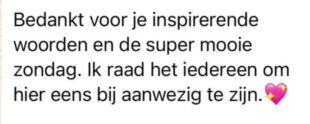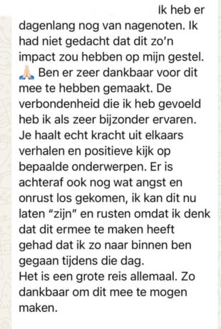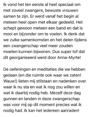 ‘Ik vond dit een hele mooie wijze van stilstaan bij mijn zwangerschap en de bijbehorende emoties. Het heeft mij geholpen om meer vertrouwen te voelen in mijzelf en in deze reis. Ik ben heel dankbaar dat ik bij deze dag aanwezig mocht zijn en ik zou het zeker aanraden aan andere zwangeren die samen met gelijkgestemden naar binnen willen keren in deze bijzondere periode van hun leven.’