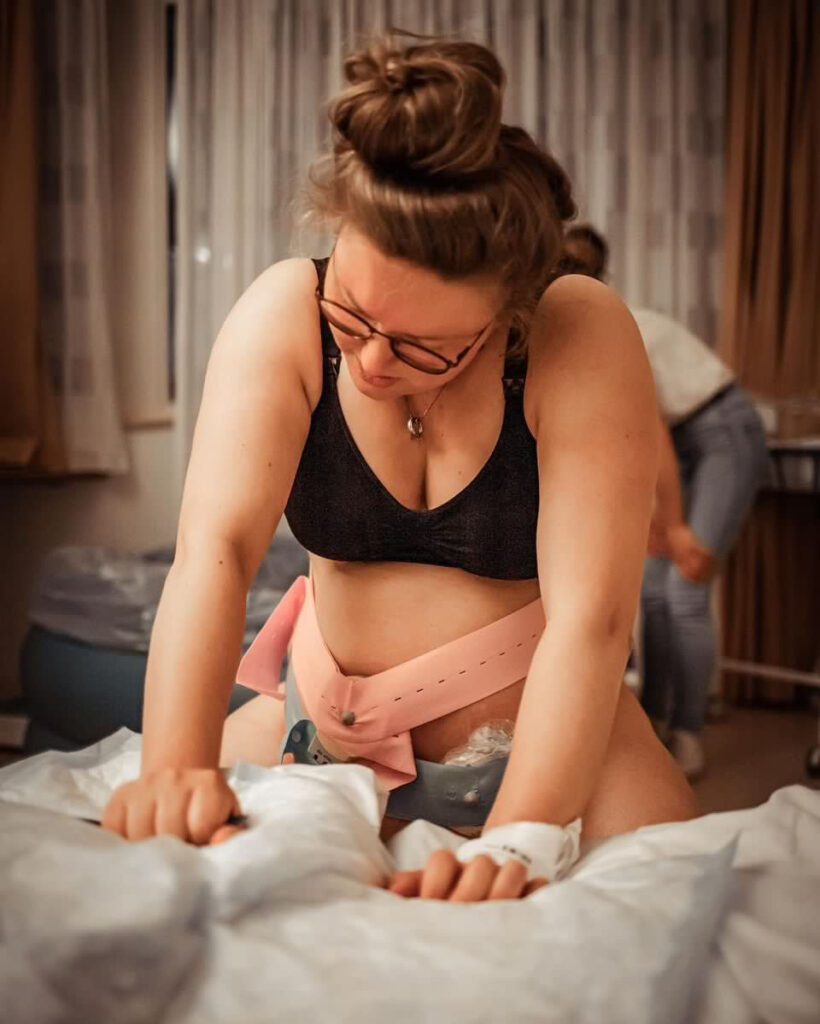 Ik wilde echt niet op mijn rug bevallen, dat voelde helemaal niet fijn! Dus ik ging -ja, ondanks de ruggenprik- overeind zitten. Ik belandde uiteindelijk in de “aanzoekshouding” 😜 Dat voelde echt het lekkerste!