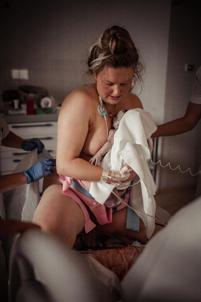 Het was een mega heftige bevalling, ze was zo kwetsbaar en klein. Maar ik voelde me echt een baas in eigen buik. Echt een team, samen met mijn man, vriendin/fotograaf en de artsen!’