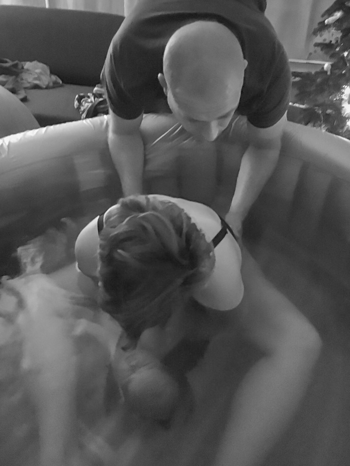 Ik heb nog steeds mijn ogen dicht om goed bij mezelf te kunnen blijven. Dan zegt de verloskundige: ‘Kijk eens, pak het eens, kijk eens Esther, kijk eens.’. Omdat ik mijn naam hoor, open ik mijn ogen en zie daar het lichaam van mijn baby geboren worden onder water! Vol verwondering en ontzag roep ik ‘Ah!’ en daar floept het lijfje het water in.