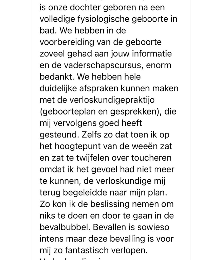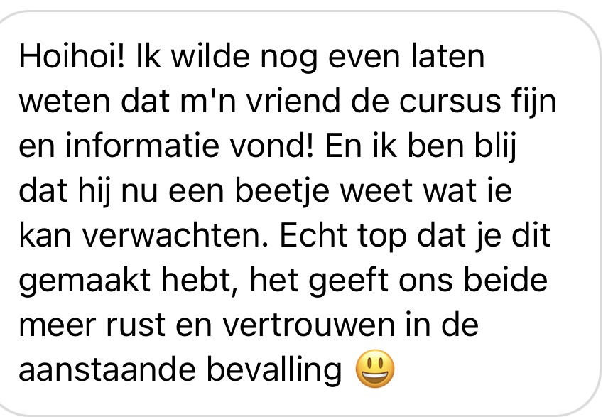 Nee, een paar handouts uit de Vrije Geboorte cursus komen ook in de vadercursus voor. Maar de meeste handouts zijn speciaal gemaakt voor de partner en deze cursus is specifiek geschreven voor vaders/ partners, terwijl ik me in de gewone Vrije Geboorte cursus richt tot de zwangere mama’s. Als je dieper op allerlei onderwerpen wilt ingaan is het zeker aan te raden om ook lesjes uit de Vrije Geboorte cursus te volgen.