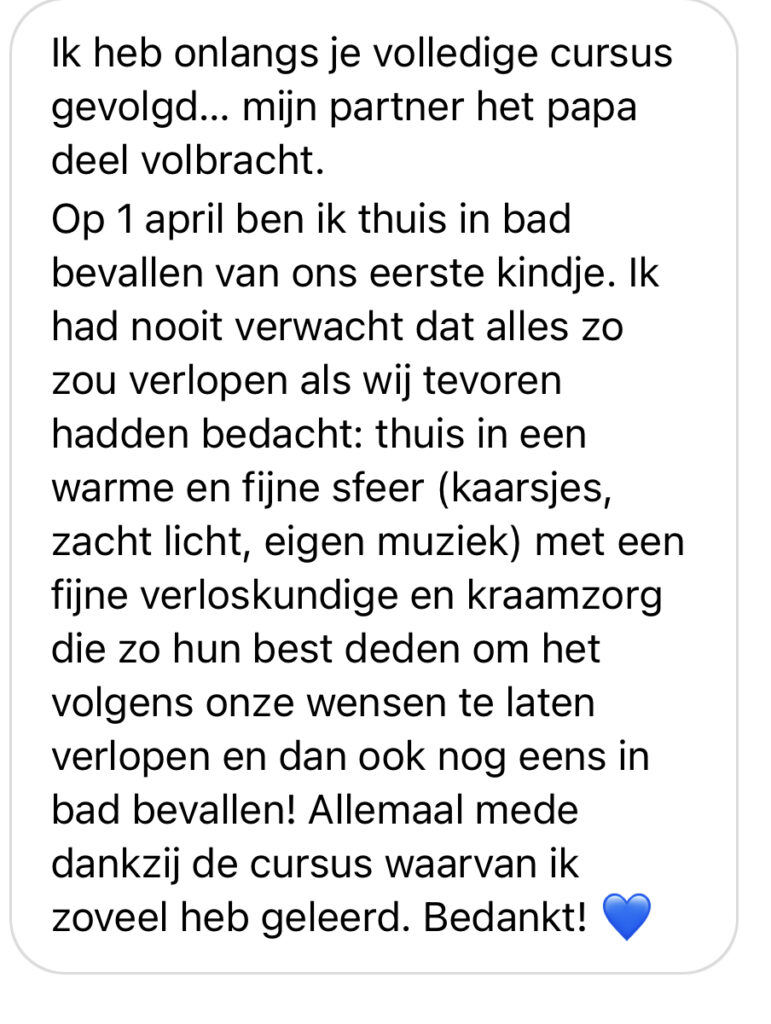 Ik ontdekte dat je als bevallende vrouw heel veel invloed hebt op hoe de bevalling verloopt, of je bevalling nou medisch is of niet. En dat een bevalling een positieve ervaring kan zijn, wat er ook gebeurt. Als je weet hoe het geboorteproces werkt, dan kun je je er vol vertrouwen aan overgeven en het proces zelfs helpen. Zo wordt een bevalling geen gebeurtenis waarbij alles je maar overkomt, maar een life event waar jij straks met vreugde op terug kunt kijken.